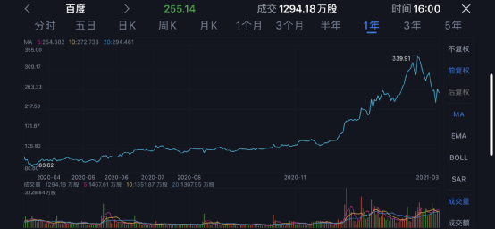 回顾百度过去一年曲折且陡峭的股价曲线不难发现,2020年12月是一个关键时间点,在此之前,百度股价处在平缓回调的轨道上,但在12月中旬,百度股价极速拉升,很快重回2015年市值突破800亿美元的巅峰时刻。此后两个月内,百度股价仍持续走高,一度触及354美元,市值来到前所未有的1200亿美元。