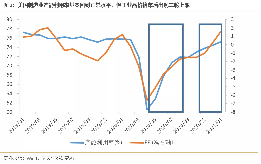 2021年1月美国制造业产能利用率已从上年4月的历史最低点60.5%恢复至75.2%,同比下滑0.5%,基本回到了正常水平;但供需错配的结构性问题仍然明显,工业品价格出现了二轮上涨。