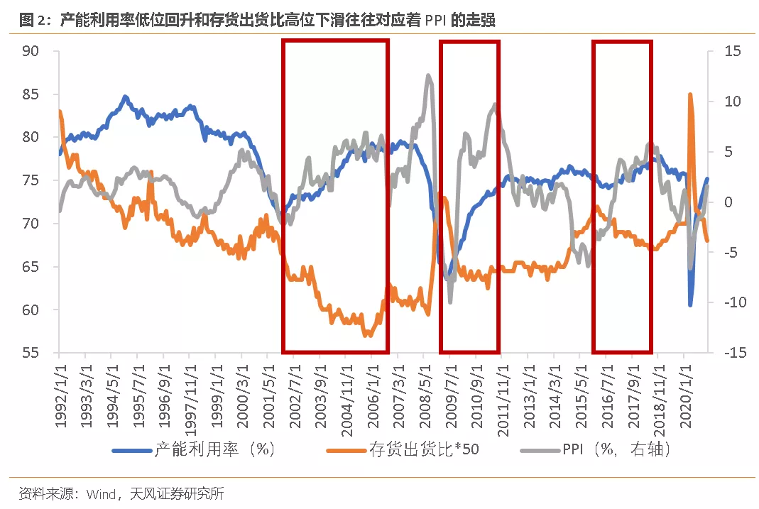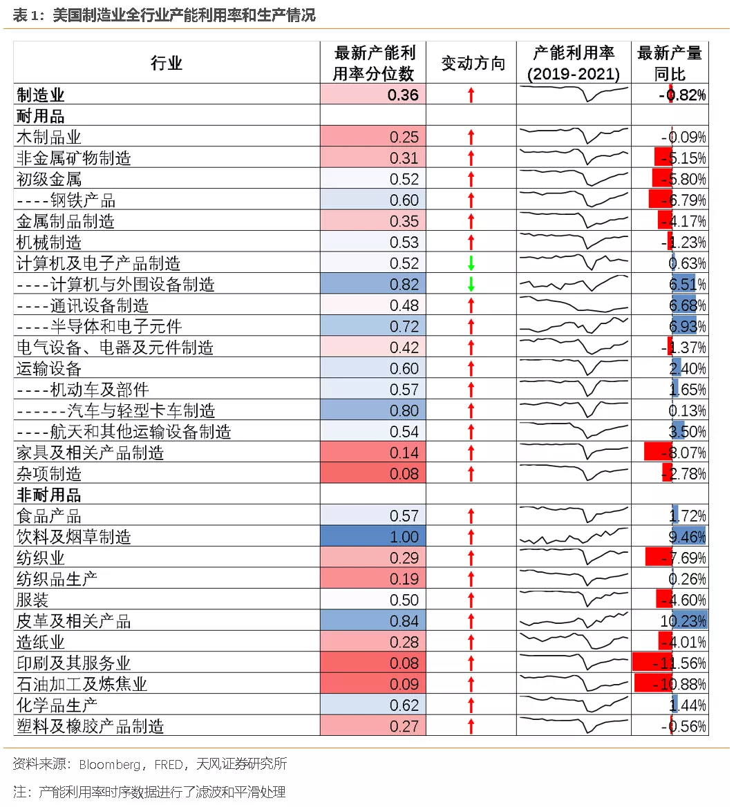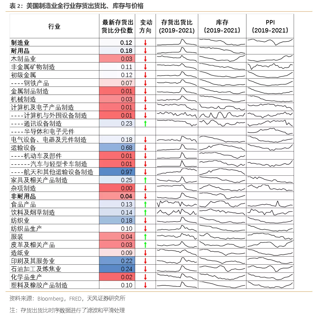为了厘清哪些行业内生性涨价动力更强,我们从产能利用率和存货出货比两个角度, 计量美国制造业的供需错配程度。从历史数据看,产能利用率低位回升、存货出货比高位回落往往对应着工业品价格的走强。具有上述特征的行业供需错配明显,有更大的涨价空间。