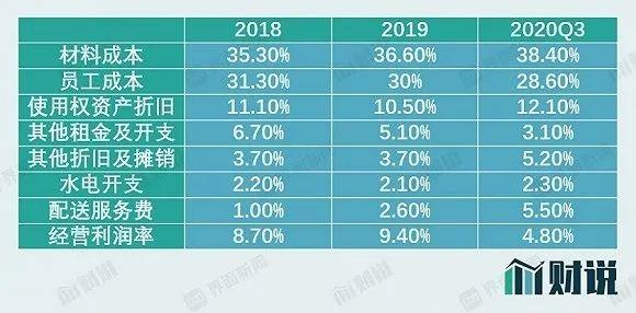 奈雪高级公关总监王依曾告诉记者,奈雪与喜茶的店型完全不一样,后者所开的大多是“takeaway”的小店,而奈雪基本都是大店,平均面积在200平米以上,每个店面的员工将近20人。招股书显示,奈雪的各项成本中,材料成本和员工成本占据大头,前者近三年来维持在35%以上,后者也高达30%左右。