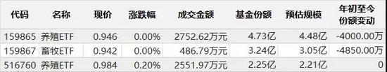 不过前几天上市的2只ETF上市后,份额就出现了减少,养殖ETF(159865)和畜牧ETF(159867)份额自上市以来分别减少了4000万份和4850万份。