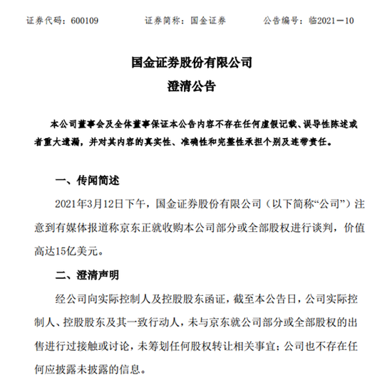 今日收盘后,国金证券发布公告称,经公司向实际控制人及控股股东函证,公司实际控制人、控股股东及其一致行动人,未与京东就公司部分或全部股权的出售进行过接触或讨论,未筹划任何股权转让相关事宜。