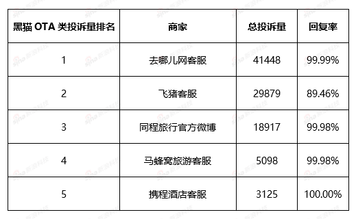 从数据来看,总的来说,OTA类投诉数量一枝独秀,对投诉的反馈速度还可以,但飞猪的回复率明显低于其他同业。
