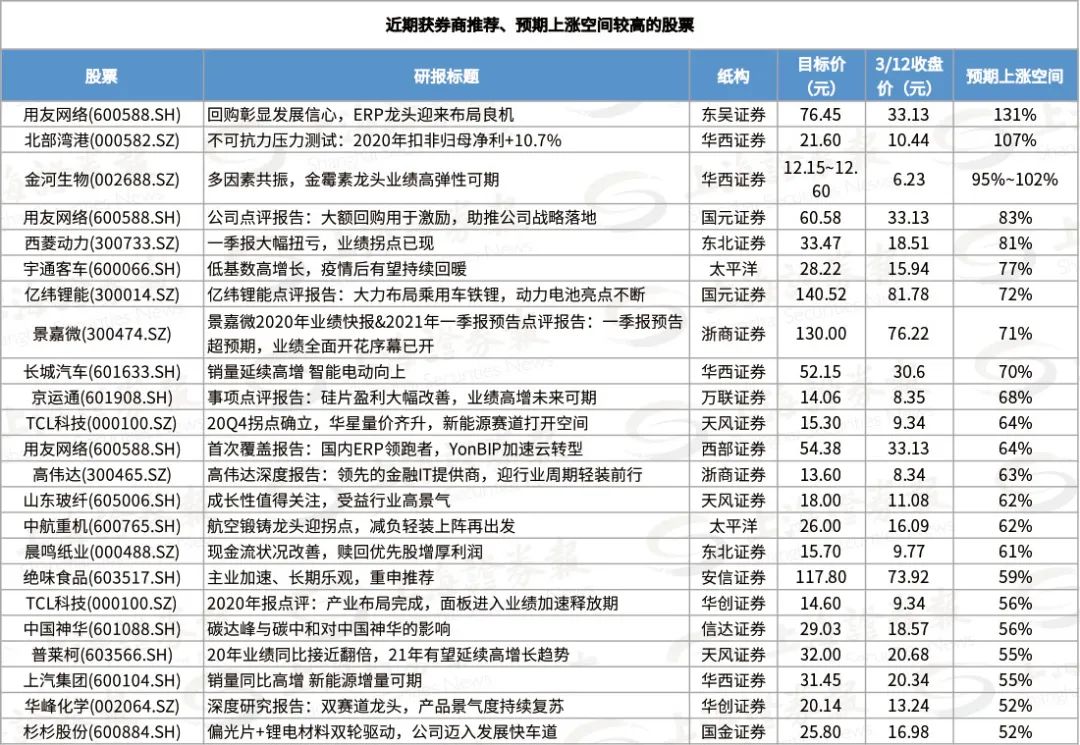 从过去一周券商推荐股票的预期上涨空间来看,当前约有20余只股票相比券商目标价的预期上涨空间超50%,其中对于用友网络、北部湾港、金河生物,部分券商给出了较高目标价,目前还有翻倍的空间。