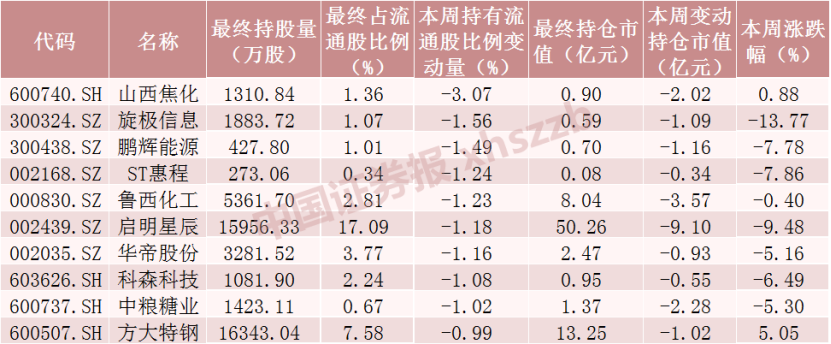 从市场表现看,本周北向资金持有流通股比例减少前十个股中,仅有山西焦化、方大特钢分别上涨0.88%、5.05%,其他8只个股均下跌,旋极信息跌幅最大,下跌13.77%。