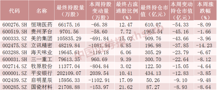 从持仓市值变动情况看,本周北向资金对29只个股的持仓市值减少超过5亿元,对恒瑞医药、贵州茅台、美的集团持仓市值减少金额居前,分别减少54.33亿元、45.16亿元、43.66亿元。