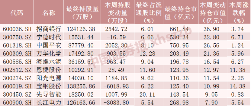本周北向资金持仓市值增加额前十个股中,宁德时代、宝钢股份、长江电力被分别减仓16.59万股、6018.93万股、3083.80万股,其他7只个股均被加仓,对招商银行、中国平安、阳光电源、先导智能加仓股数超1000万股。