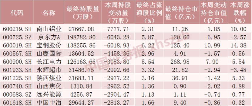 从市场表现看,本周北向资金减仓股数前十个股中,京东方A、永辉超市分别下跌2.57%、3.48%,其他8只个股均上涨,宝钢股份涨幅最大。