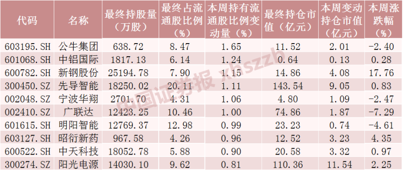 从持有流通股比例情况来看,本周北向资金对6只个股的持有流通股比例增加1个百分点以上,其中对公牛集团持有流通股比例增加1.65个百分点,对中铝国际、新钢股份持有流通股比例分别增加1.24个百分点和1.15个百分点。