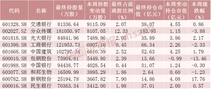 从市场表现看,本周北向资金加仓股数前十的个股涨跌参半,新钢股份涨幅最大,上涨17.76%,包钢股份跌幅最大,下跌13.46%。