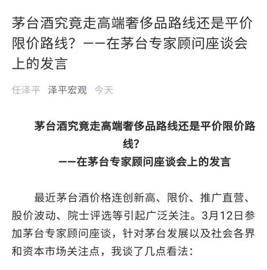 今日,著名经济学家任泽平微信号发了一篇关于茅台专家顾问座谈的内容,围绕“茅台酒究竟走高端奢侈品路线还是平价现价路线”问题进行了重点解析。