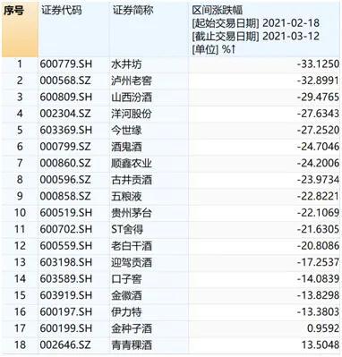 同一时间段,水井坊、泸州老窖下跌幅度均超30%。