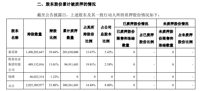截至目前,秦英林累计质押2亿股,占起所持股份的13.67%,占牧原股份总股本的5.42%。牧原实业集团累计质押9691万股,占起所持股份的19.81%,占牧原股份总股本的2.58%。