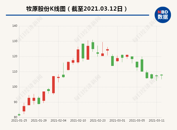 近期,牧原股份股价冲击高点后逐渐走低,截至周五收盘,牧原股份涨0.48%,股价报107.67元,总市值为4048亿元。