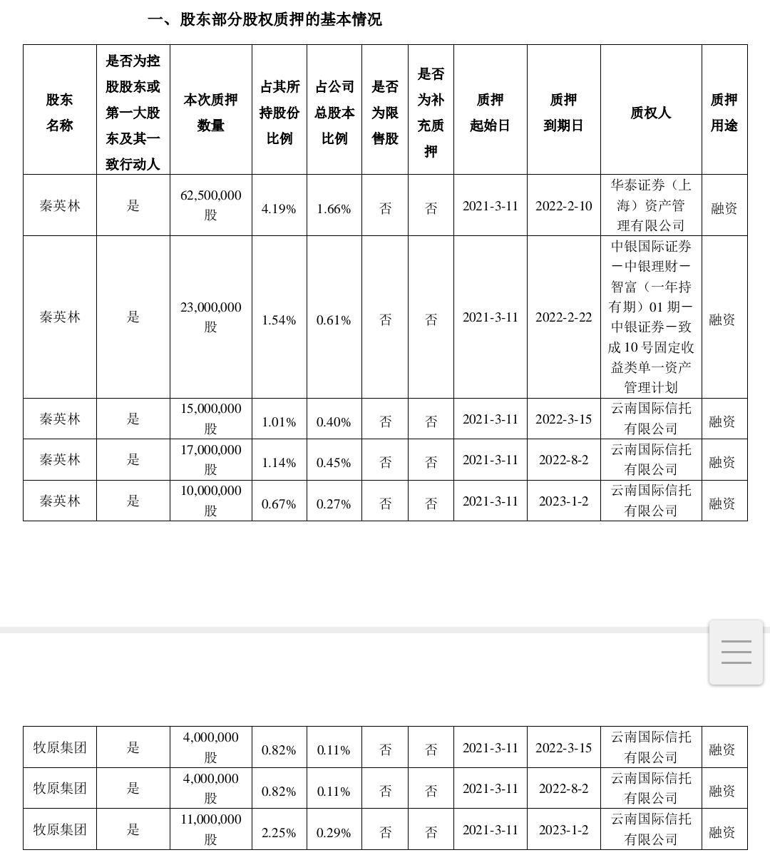 秦英林于2021年3月11日质押约1.28亿股,占其所持股份比例为8.55%。牧原集团于2021年3月11日质押1900万股,占其所持股份比例为3.89%。质权人包括华泰证券(上海)资产管理有限公司、云南国际信托等。质押用途均为融资。