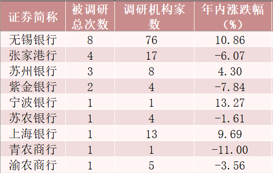 与此同时,有9家银行股迎来机构密集调研,与往年相比明显火热。其中无锡银行迎来8次机构调研,位居榜首,高毅、喜马拉雅资本也参与其中。