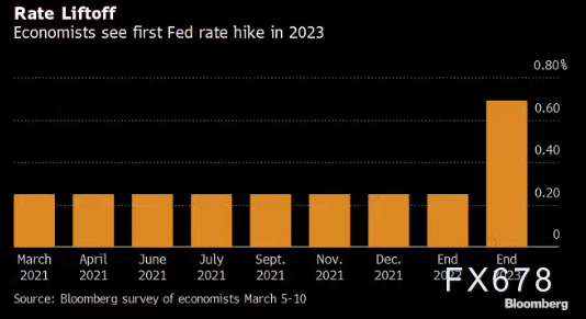 经济学家认为,2023年将出现两次幅度都是25个基点的加息。但他们还预计美联储本周公布政策声明之际所发布的点阵图中值预测,料显示利率在那一年的全年都将保持在接近零的水平。