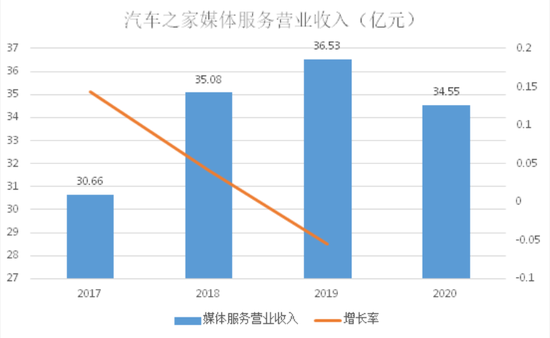 汽车之家刚开始是汽车类垂类网站,但其垂类媒体业务却一直在走下坡路。招股书显示,汽车之家2017、2018、2019年和2020年媒体服务营收分别为30.66亿、35.08亿、36.53亿、34.55亿,汽车之家媒体服务业务增长愈发停滞,并呈下降趋势。
