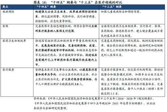 “十三五”对医疗领域的描述主要与医保相关,“十四五”的重点则在通过医药卫生体制改革去发展检验检测、创新药、医疗器械和医疗服务等领域,意味着“十四五”阶段,医疗领域将由基础保障向高端的研发和医疗服务的提升升级。具体而言,“十四五”纲要在“十三五”的基础上增加了对“构建强大公共卫生体系”的描述,提出完善医疗器械、创新药和疫苗等的快速审评审批制度,并将每千人拥有的执业医师数量由2.5人提升至3.8人(“十四五”纲要中表述为注册护士数量提升)。