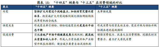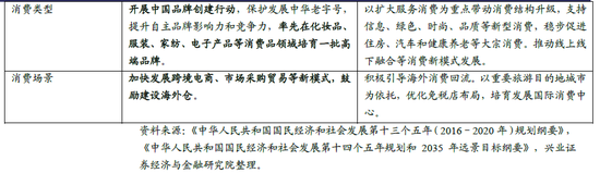 ——“十四五”纲要对促进内需的重视程度较“十三五”大幅提高,并提出开展中国品牌创建活动,发展跨境电商、海外仓等新的贸易形式。“十四五”规划和2035远景目标纲要(以下简称“十四五”纲要)对促进内需的重视程度较“十三五”大幅提高,首次对内需单独成篇,不同于以往将消费、内需融入多个章节的做法。提出“供需更高水平动态平衡”、“加快培育完整内需体系”、“全面促进消费”等主要纲领,并在多个消费场景提出具体措施,对需求与供给的关系、国内大循环和国内国际双循环的政策体系、如何培育完整内需体系等进行了详细论述。并为全面促进消费提出了具体的场景,并在传统场景之外增添了互联网线上、海外仓等新型消费领域。