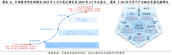 数字经济作为新的要素,其与居民消费相互结合,有望成为中国中长期经济增长的动力源。数字经济不仅可以带动新型基础建设,更重要的是改变人们的生活方式、催生实体经济新业态,如在线教育、线上办公、互联网医疗、智能制造、万物互联等,具备广阔的未来前景。回顾4G时代移动互联网发展的十年,社交、视频、网购、移动支付、手机游戏等业态发展如火如荼,十年间实现数十倍增长,甚至还衍生出了短视频、直播带货、外卖快递、氪金充值、游戏直播等“新经济”业态。在从移动互联网到产业互联网的发展转变过程中,产业数字化加速释放经济增长潜力,数字产业化催生经济增长新动能。在我国经济高质量发展需求驱动下,各产业开始积极向更加合理、高效、可持续的发展模式转变,数字技术成为这个过程中的重要推动力,为产业的数字转型创造了必要条件。伴随新一代信息技术蓬勃发展,以5G、大数据、人工智能为代表的数字产业逐渐成为我国产业结构中的重要组成部分。
