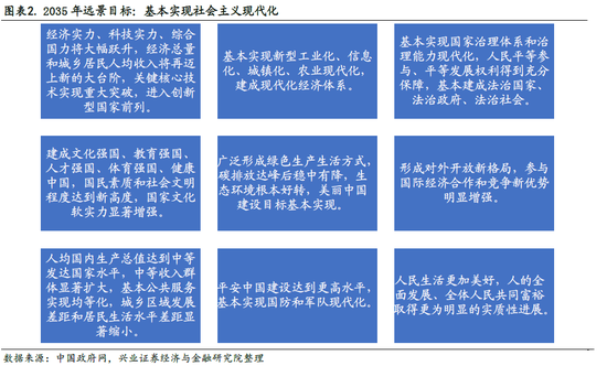 2035年远景目标:中国将基本实现社会主义现代化,形成对外开放新格局,参与国际经济合作和竞争新优势明显增强。