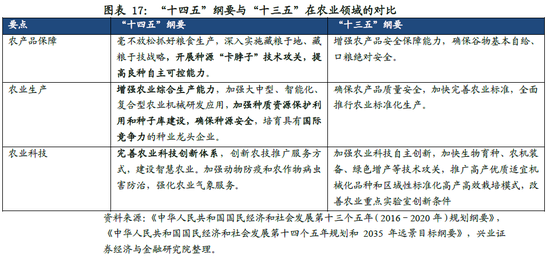 “十四五”期间农业生产水平由“十三五”的保障转为提质,新增对多个农业生产领域的描述,如农业机械研发、种质资源保护、动物防疫和病虫害防治等。“十四五”对农业表述的重点在生产的综合性、科技力和智能化,这意味着农业在社会生产中不只是基础的粮食保障,也可以成为国家综合性的科技产业。具有国际科技竞争实力、生产体系完善的农业企业可能是未来农业领域的投资主线。