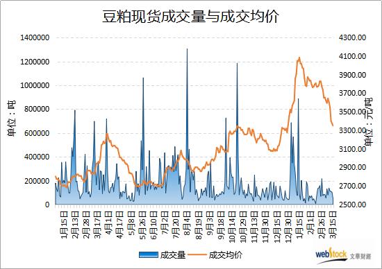 国内多地非洲猪瘟疫情有所抬头,限制了养殖户的补栏热情,且水产养殖还未恢复,需求疲弱持续压制市场。在需求低迷的背景下,下游提货较慢,豆粕库存压力也有所增加,期现价格不断刷新今年以来低点。3月15日,国内主流油厂豆粕成交缩水,当日总成交量为48500吨,较上日减少54500吨,连续第四日下降,创下逾3周低位。成交均价为3350元/吨,较上日下跌24.44元/吨,连跌第五日,跌破11周低位。