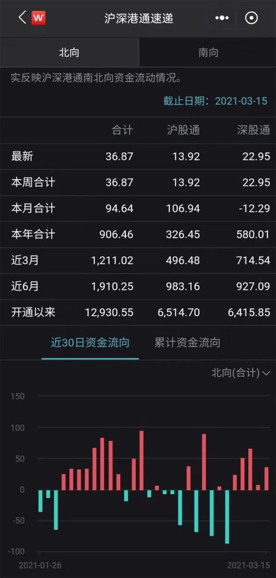 昨日,北向资金全天逆势净买入36.87亿元。据统计,3月9日至3月15日,北向资金已连续5个交易日净买入,3月9日至12日净买额分别为24.31亿元、52.25亿元、67.19亿元、8.27亿元。