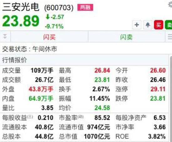 盘面上,半导体板块整体走弱。其中,三安光电闪崩逼近跌停,截至午盘,报23.89元,股价创去年11月以来新低,较1月13日创出的历史最高价36.44元已回撤近35%。三安光电目前成交额放大至26.7亿元,最新市值1070亿元。此外,士兰微、北方华创、华润微等纷纷跟跌。