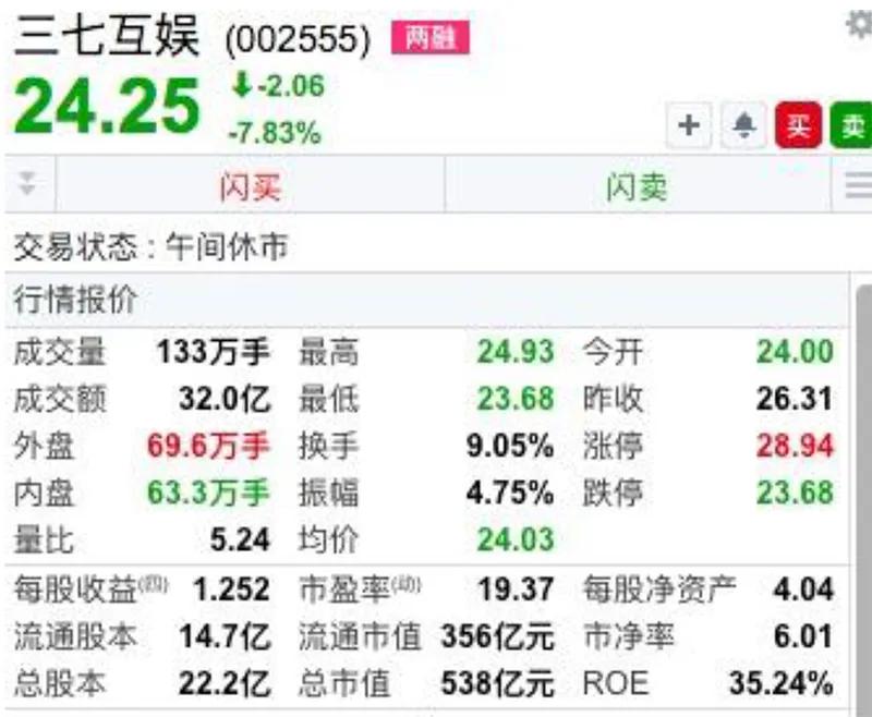 虽然此前世纪华通表示,腾讯大手笔增持,但是并未给游戏股带来重生的希望。今日早盘,三七互娱继上一交易日跌停后继续大跌近8%,报24.24元/股,较2020年7月时的50.7元高位已腰斩,彼时总市值也曾超过1000亿元,如今只有538亿元。