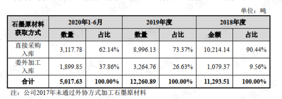 2018年至今,通过外协方式获取的石墨原材料比重逐年上升,2020年上半年达37.86%。
