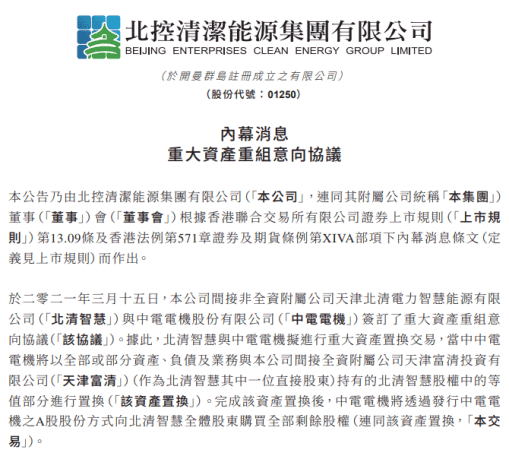 当日,港股上市公司北控清洁能源集团发布公告称,间接非全资附属公司北清智慧与中电电机签订了重大资产重组意向协议。据此,北清智慧与中电电机拟进行重大资产置换交易,资产置换后由中电电机发行股份购买剩余股份。