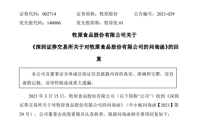 在3月15日受到深交所问询后,3月16日晚间,牧原股份公告回复了相关问题,也切合了当前市场关注热点。
