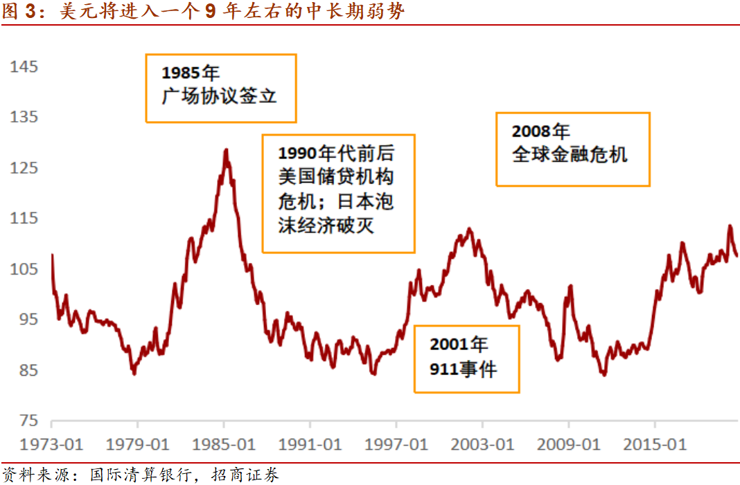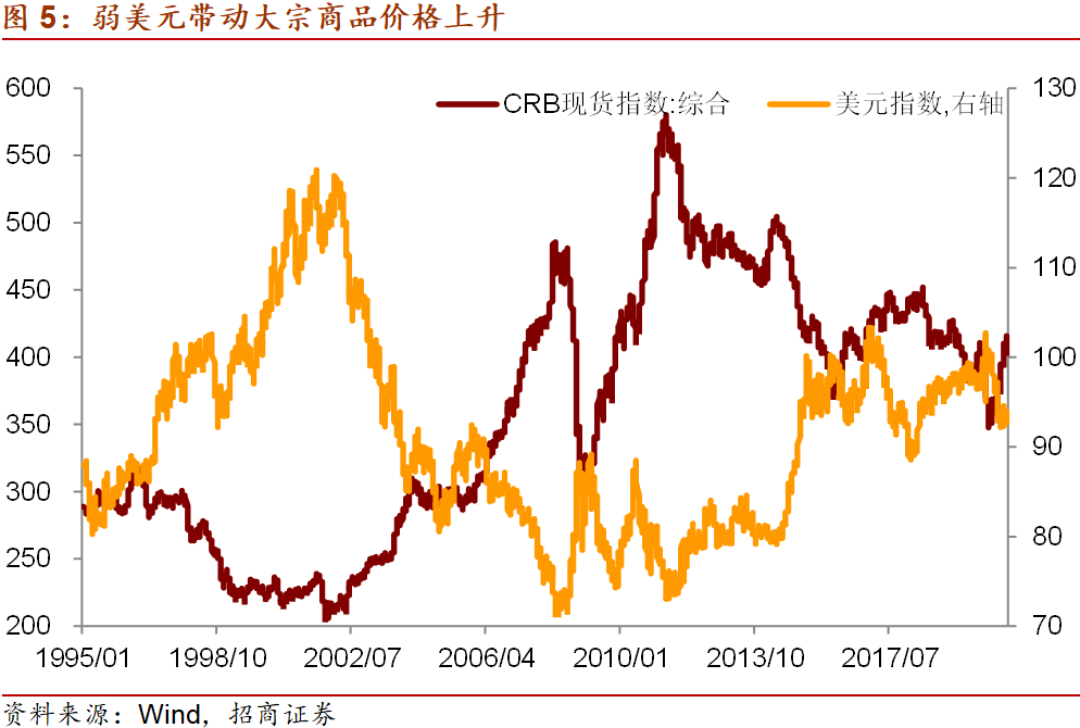 3、弱美元带动大宗商品价格上升,这是我们强调“9年大宗商品牛市”的出发点,股票市场中的顺周期板块也将产生足够的投资吸引力。