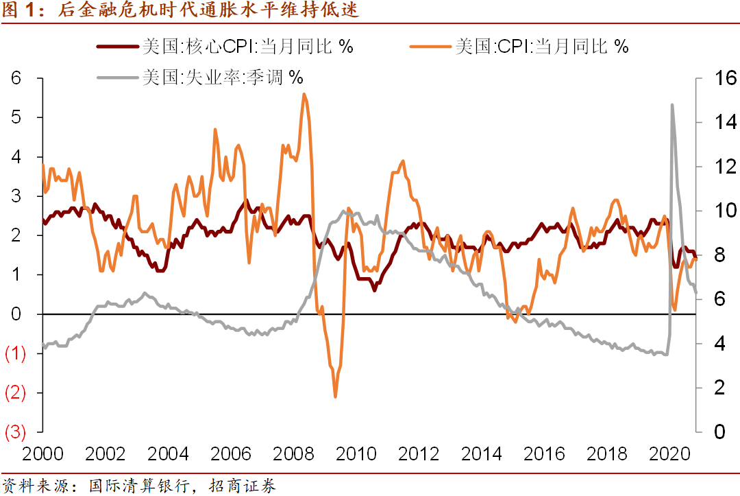 综上,美联储货币政策转向所考虑的因素是非常综合的,包括劳动力市场改善程度、经济基本面、内外部风险、经济前景等,通胀固然是其中一个影响因素,但对它的考虑也是动态的,如果缺乏良好的劳动力市场和经济基本面支撑,通胀不能持续,更不能代表经济已经达到了潜在增速水平,因而不会简单作为货币政策收紧的依据。2021年1月的FOMC议息会上,美联储按兵不动并维持鸽派态度,近期美联储官员的表态也一致意指维持宽松。我们判断,2021年美联储将维持宽松的货币政策立场,Taper时点或在2021年末。