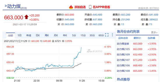 3月17日早盘,动力煤主力合约盘中快速拉升,截至上午收盘,涨幅3.95%,报价663元/吨。