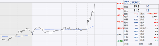 与之相关的认购期权出现大幅上涨,其中,行权价为670元/吨的动煤2105认购期权涨幅超100%。