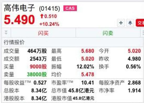 港股高伟电子早盘一度急升逾13%,市场憧憬其受益于欧菲光退出苹果产业链。截至发稿,高伟电子涨逾10%,成交额2811万港元。