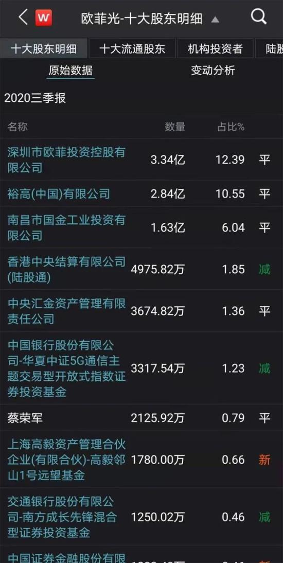 欧菲光2020年三季报显示,知名私募大佬冯柳管理的高毅邻山1号远望私募基金位列前十大股东,持有欧菲光1780万股,占总股本比例的0.66%。冯柳是否已经减仓目前尚不清楚。
