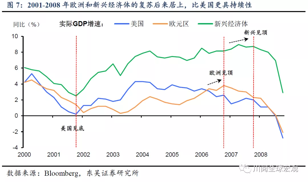 如图所示,美国GDP增速在2001年的见底开启了这轮大宗商品的涨势,虽然到2006年已经开始回落,但欧元区和新兴经济体的复苏仍在加速,尤其是新兴经济体,在欧元区的复苏于2007年见顶后又强势复苏了一年(图7)。