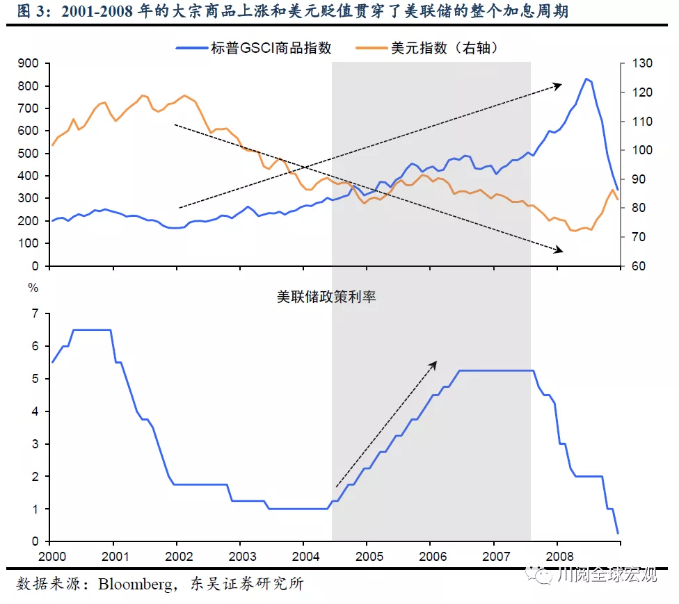 二是这轮上涨处于美元的贬值周期,并且贯穿了美联储的加息周期。美元指数在2002-2008年期间贬值了39%,无疑是此轮大宗商品上涨的一大推手。