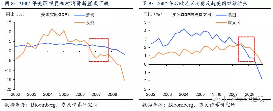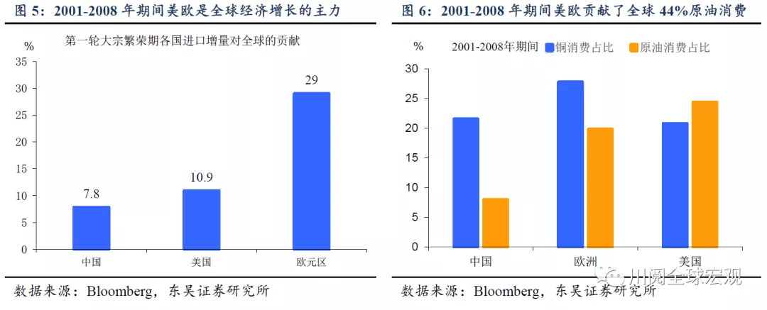上述三个现象的产生,都可以从全球经济的基本面中寻找答案:首先,2001-2008年间拉动全球经济增长的主力军是欧美而非中国。虽然中国的工业化进程是这一时期的亮点,但中国的经济体量刚赶上德国,对全球经济增长的贡献远不及美欧(图5)。