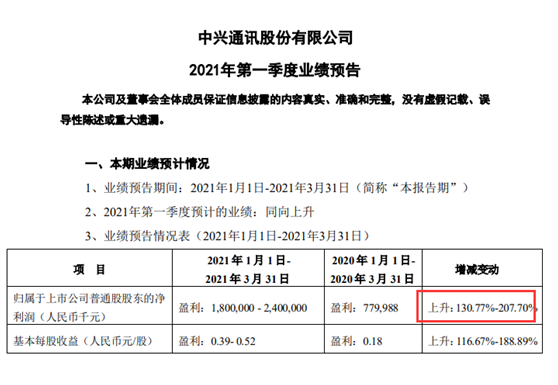 中兴通讯同时披露的2021年一季报业绩预告显示,公司预计2021年第一季度归属于上市公司普通股股东的净利润达到18亿元~24亿元,同比大幅增长130.77%~207.70%,预计实现基本每股收益0.39元~0.52元,同比大幅增长116.67%~188.89%。