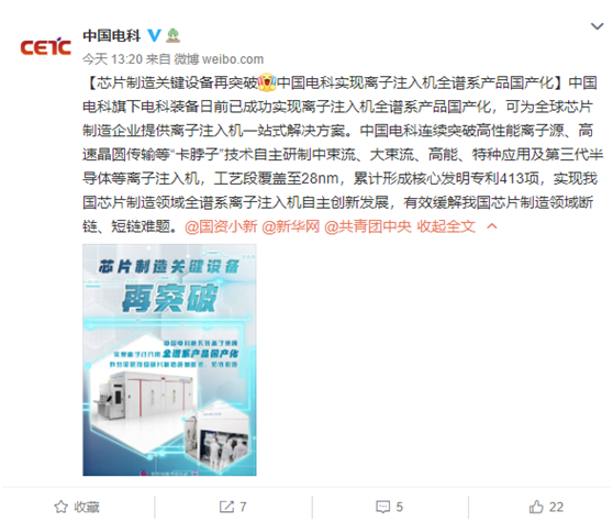 消息面上,中国电科今天宣布,中国电科旗下电科装备日前已成功实现离子注入机全谱系产品国产化,可为全球芯片制造企业提供离子注入机一站式解决方案。中国电科连续突破高性能离子源、高速晶圆传输等“卡脖子”技术自主研制中束流、大束流、高能、特种应用及第三代半导体等离子注入机,工艺段覆盖至28nm,累计形成核心发明专利413项,实现我国芯片制造领域全谱系离子注入机自主创新发展,有效缓解我国芯片制造领域断链、短链难题。