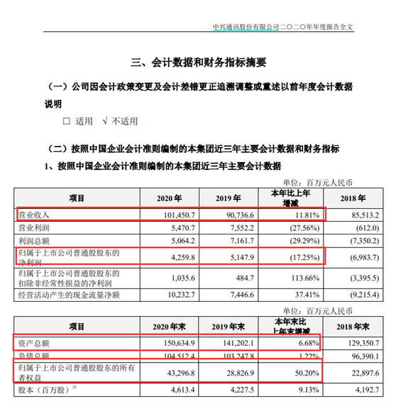 公司披露的公告显示,2020年全年,中兴通讯实现营收1014.51亿元,同比增长11.81%,实现归母净利润42.60亿元,同比增长17.25%。截至2020年末,公司资产总额1506.35亿元,同比增长6.68%,归属于上市公司普通股东的所有者权益432.97亿元,同比大幅增长50.20%。