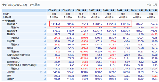 历史财务数据显示,中兴通讯2015年营收就已突破千亿元,但2018年开始,公司营收跌破1000亿元,当年也出现近70亿元的巨额亏损。2019年公司营收有所回升,但仍继续低于1000亿元。2020年度是公司营收时隔两年后,重返1000亿元以上。