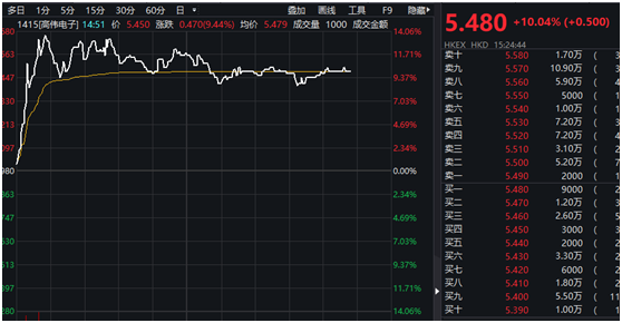 不过,另一家相关厂商高伟电子(1415.HK)股票盘中则急升逾10%。