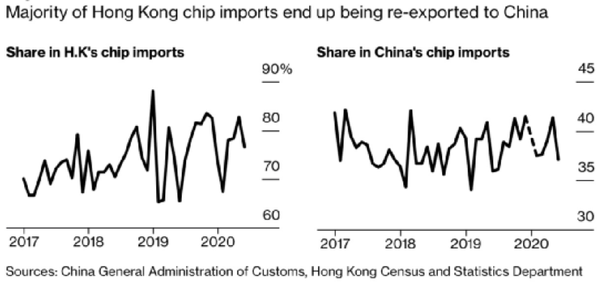 去年上半年,通过香港转往内地的半导体再出口量与2019年同期相比增长了11%,几乎是芯片总购买量增长的两倍。数据显示,从香港进口的芯片占中国芯片进口总量的38%。