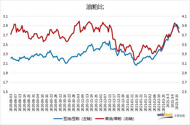 虽然需求端仍表现不佳,但上周末段以来两粕止跌反弹期价均录得四连阳,一方面经过前期的连续大幅下跌市场存在超跌反弹需求,另一方面在马棕产量大增及国储抛售豆油等利空消息打压下油脂期价回落调整,油粕套利解锁支撑粕价上行,截止今日收盘y/m回落至2.84,oi/rm亦降至3.76,连续第四日走低。